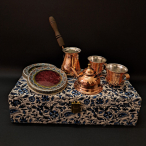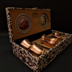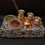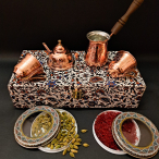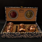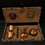 محتویات : قهوه جوش مسی ، یک جفت فنجان مسی ، قوری مسی ، 5 گرم زعفران ، 15 گرم هل سبز
